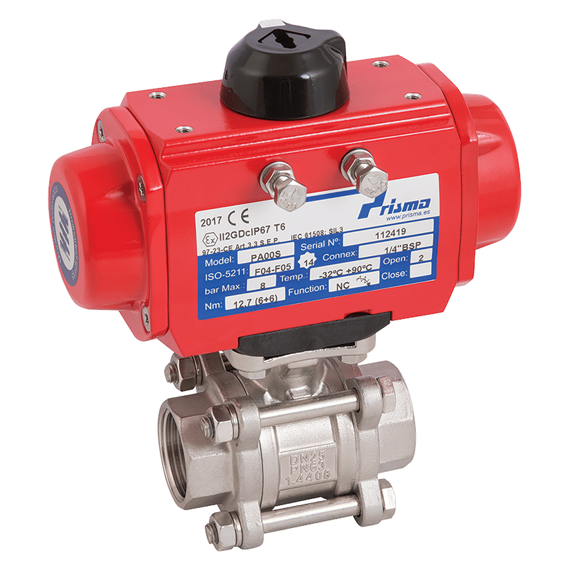 2" BSP Parallel, 3 Piece Full Bore Ball Valve Fitted with a Pneumatic Actuator, Single Acting, ATEX Approved, Stainless Steel Valve Material, Viton Seal Material, Valve Working Temperature -20°C to +200°C, Actuator Working Temperature -32°C to +80°C, Valve Maximum Working Pressure 63 bar, Prisma, Haitima